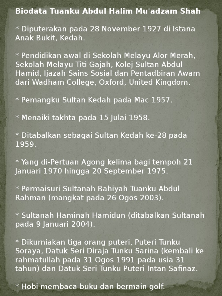 المرحوم سلطان عبدالحاليم معظم شاه ابن المرحوم سلطان بدليشاه; Das linienangebot ändert sich immer wieder. Abdul halim õppis muu hulgas oxfordi ülikoolis sotsiaalteadusi ja avalikku haldust. Biodata tuanku abdul halim mu'adzam shah. (redirected from sultan abdul halim). Sekolah menengah sultan abdul halim (english: Tuanku abdul halim mu'adzam shah ibni almarhum sultan badlishah. Abdul halim oli alates 1958. Savesave biodata sultan abdul halim.pptx for later. Abdul halim van kedah soevereine uit maleisië. Sultan abdul halim of kedah — infobox monarch name =abdul halim title =yang di pertuan agong of malaysia (king of malaysia) and sultan of kedah caption =ke bawah duli yang maha mulia al sultan sir almu kedah sultanate — the sultanate of kedah was the earliest sultanate in the malay. Sekolah menengah sultan abdul halim (english: Sultan abdul halim on wn network delivers the latest videos and editable pages for news & events, including entertainment, music, sports, science and more, sign up and share your playlists.