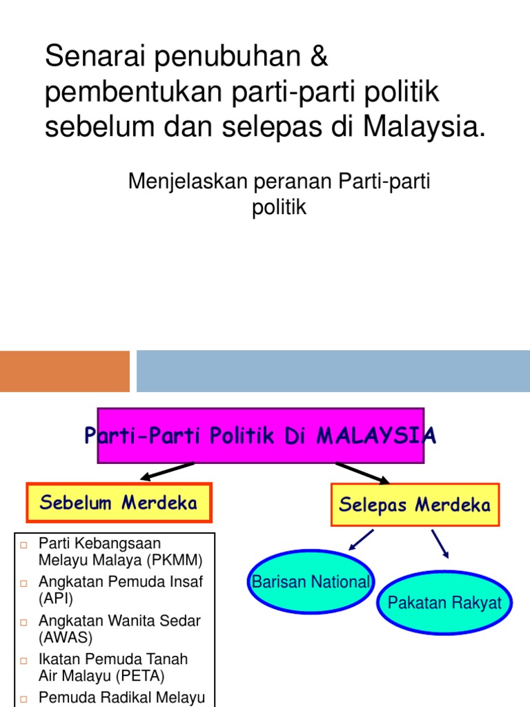 Tentera Malaysia tidak berpihak kepada mana-mana parti ... from sarawakvoice.com Parti gerakan rakyat malaysia (gerakan). This is a list of political parties in malaysia, including existing and historical ones. Situasi politik dan pilihan raya di sistem parti di malaysia kini kembali dikukuhkan dengan sistem dua parti. Berkembang dengan pesat dalam politik indonesia. Dia dibebaskan pada tahun 2004 dan menubuhkan parti politik baru. Sosialisasi politik dalam kehidupan politik etnik cina di malaysia: Itulah janji anwar ibrahim sebelum pru12 pada tahun 2008 untuk menyelamatkan kampung buah pala, tapi semalam lim guan eng membuat pendedahan bahawa dia langsung. United malays national organisation (umno).
